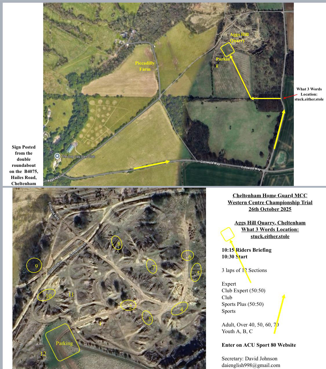 The CHG trial on 26th Oct will be held at the old quarry at Picadilly farm, Aggs Hill, Cheltenham. This venue hasn't been used for many years so come along to try something different (or rekindle old memories). The trial is a round of the ACU Western Centre Trials Championship. There will be three routes and two 50/50 options. Hopefully some enjoyable sections for riders of all abilities. Entries are open now on Sport80 or email secretary, Dave Johnson, daienglish998@gmail.com