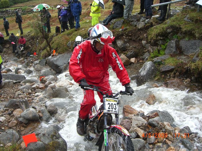 May 6 (Day 3), update 1 - Astonishingly enough, it's rained again. John Luff has had the particular pleasure of draining the carb on the moors today, as he explains: "Rain no worse. Water everywhere. I had to strip the carb half way round as it was full of water, so had to ride fast to make up time. Mamore Road was like a river." Maybe Thursday will bring better weather. On the other hand, maybe it won't - to to "adverse weather", the start is to be delayed by more than 3 hours. That's what it says on the results, which are incomplete at present. Must have been a tough day, as Doug Lampkin lost his clean sheet to go to 10.